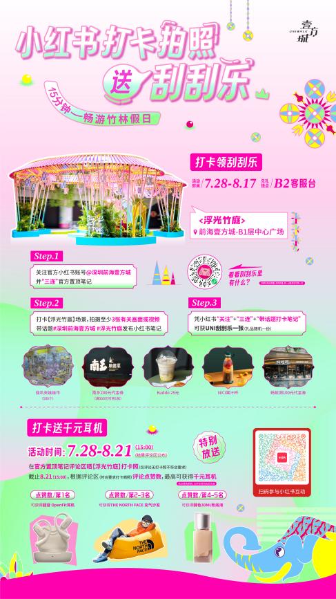 小红书打卡活动同步限时开启!7月28日至8月17日关注@深圳前海壹方城小红书官方账号并“三连”官方置顶笔记,并打卡【浮光竹庭】发布至小红书带上话题,即可到B2客服台领取刮刮乐一张,获赞最高可获得价值千元的韶音蓝牙耳机一副,惊喜礼品大放送。