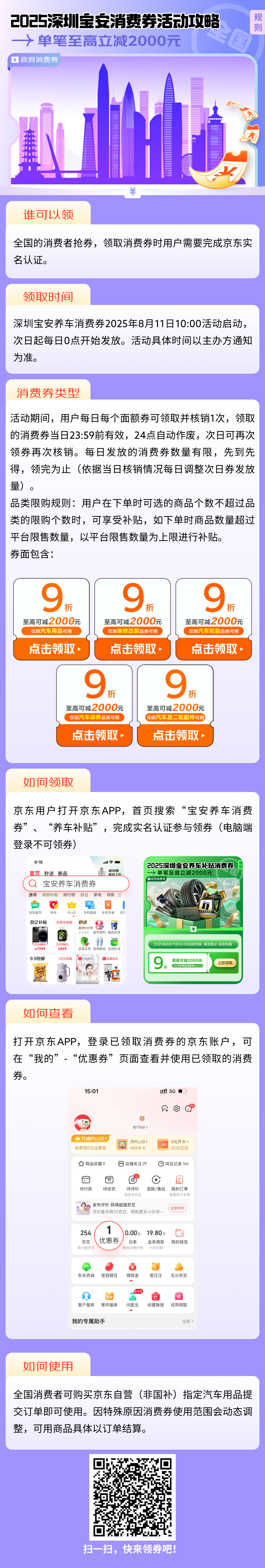 据了解,深圳市宝安区商务局联合京东汽车,重磅推出2025年“818汽车节”宝安区电子消费券促消费活动。活动将于8月11日上午10时在京东平台正式启动,将持续至10月15日,消费券发完即止。