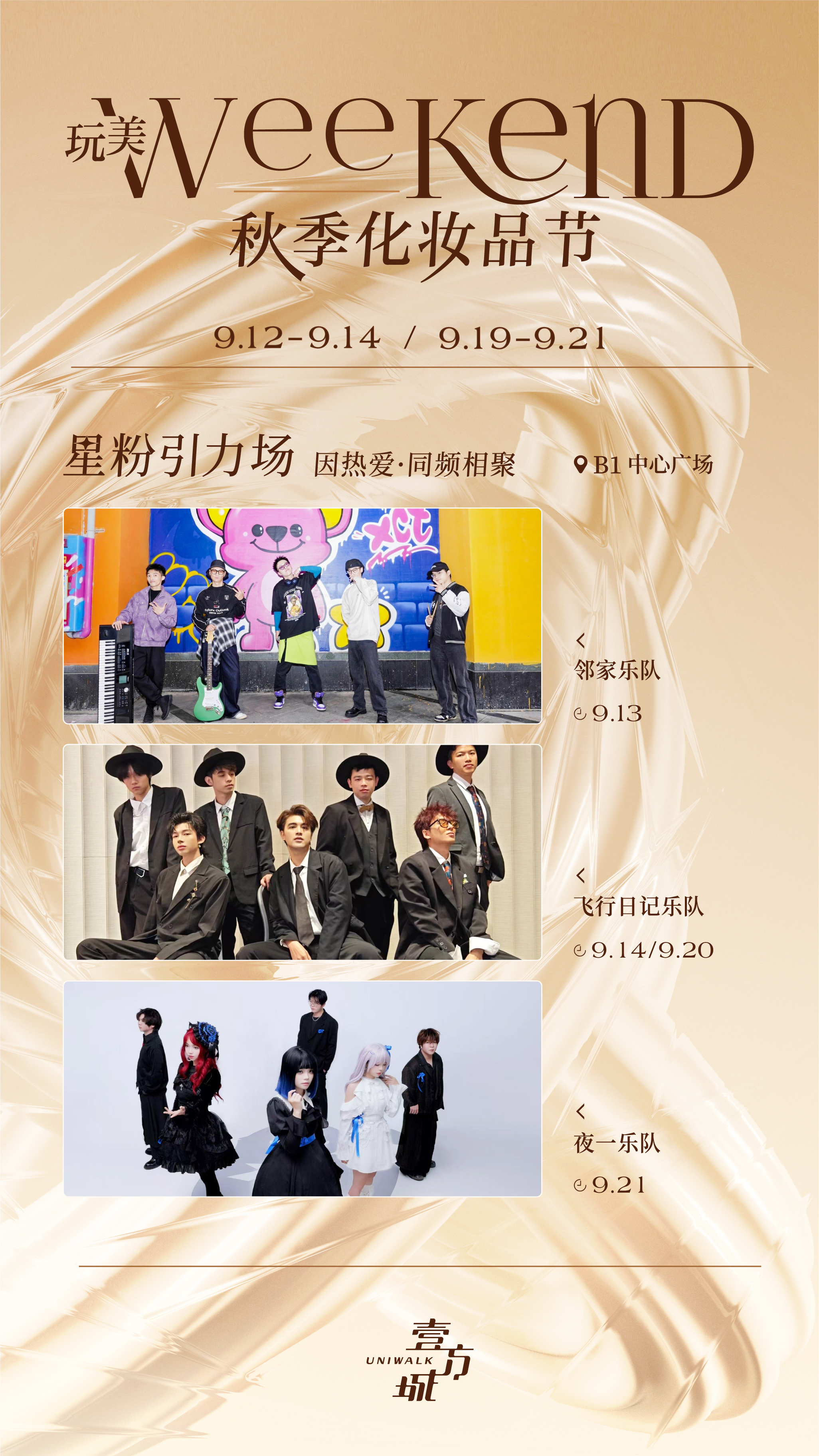 这个秋天,深圳前海壹方城为市民带来一场融合音乐狂欢与美妆优惠的秋日盛典。9月12日至14日、19日至21日,秋季化妆品节热力开启,“星粉引力场”乐队Live演出与国际美妆福利双双来袭,打造沉浸式消费体验。