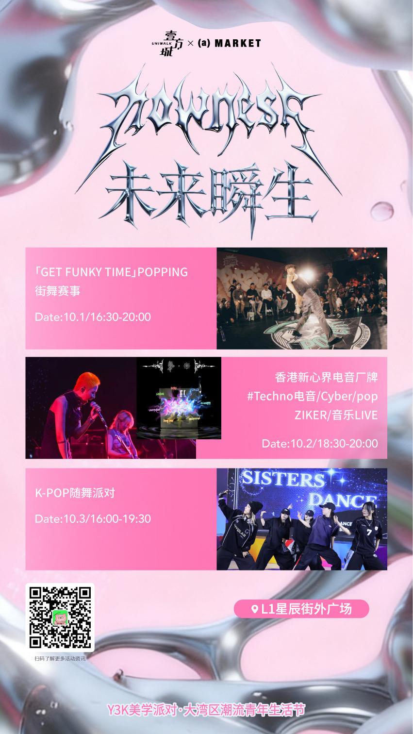 10月1日至3日,这里将举行深圳独家Y3K美学派对·大湾区潮流青年生活节,紧跟当下年轻人的潮流趋势,设置策展型美学MARKET、艺术打卡装置、小众文创市集,再加之街舞大赛、电音Live、粉丝应援等活动,让热爱时尚与潮流的年轻人在此与复古机械美学“撞个满怀”。