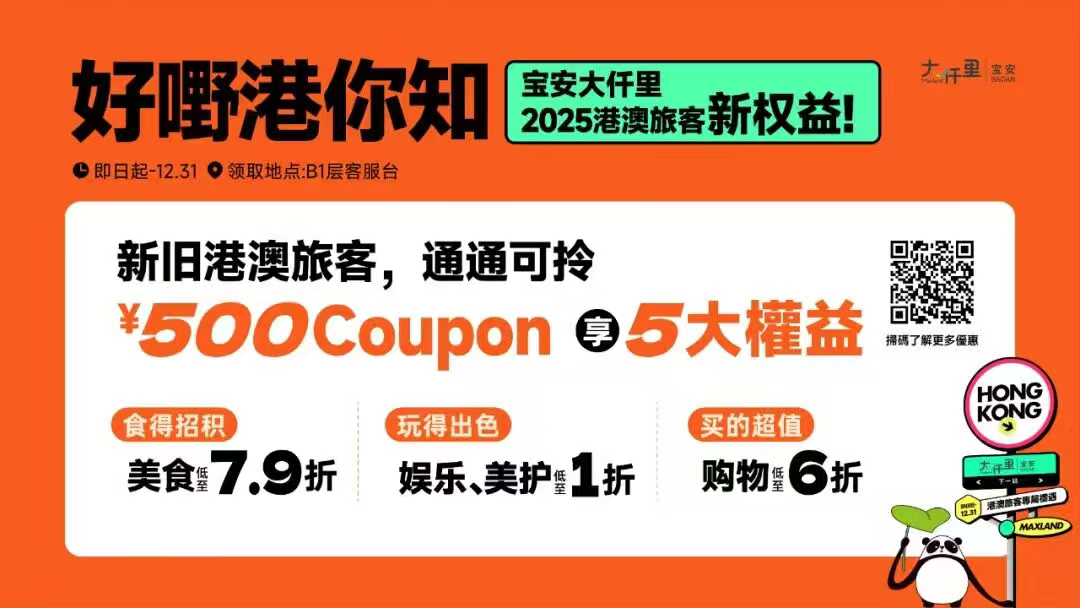 值得一提的是,本次“十一”假期,大仟里面向港澳旅客开通了一系列专属礼遇!港澳旅客可凭有效证件,前往商场客服中心领取总价值500元的优惠券大礼包(涵盖茶饮券、服饰券、餐饮券等)和500会员积分、行李免费寄存、酒店专属折扣等5项专属权益。