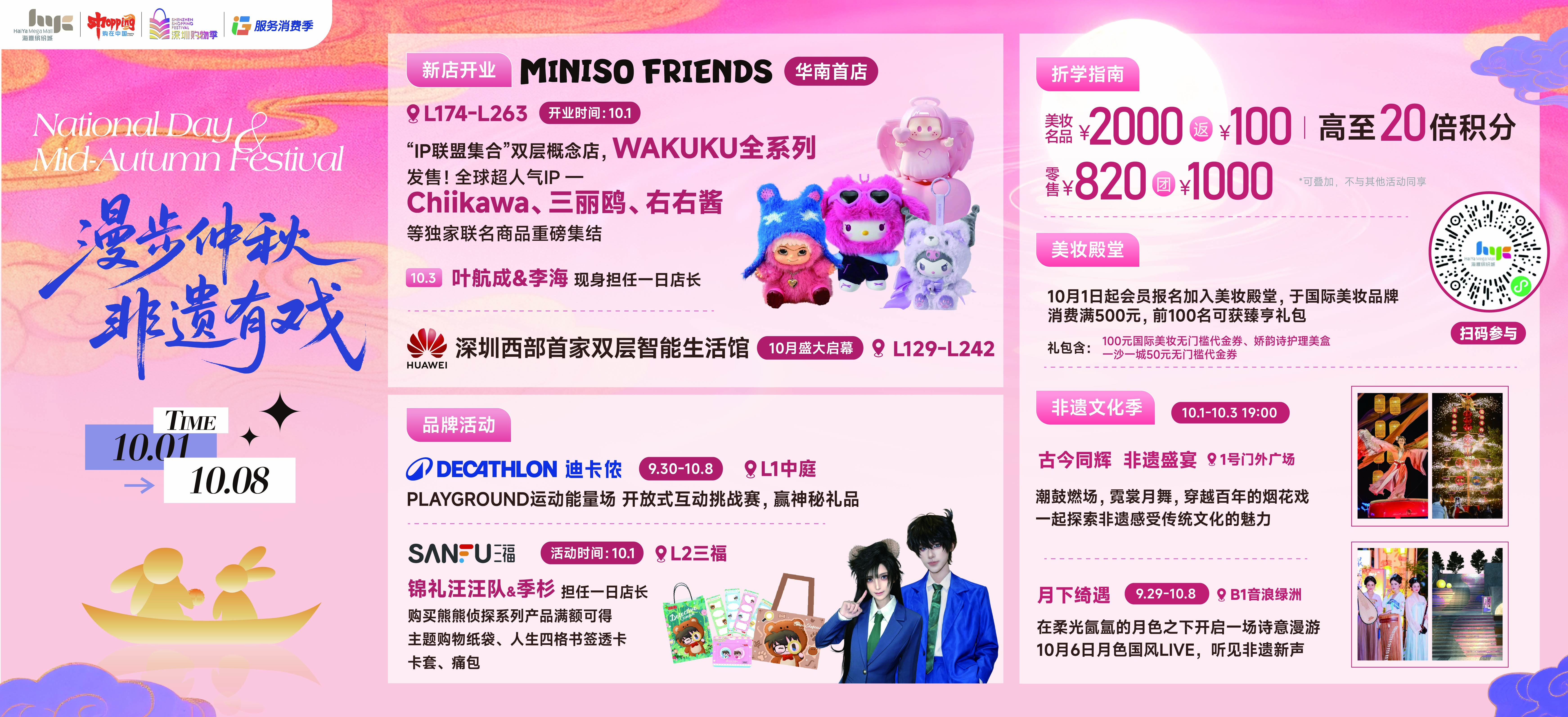 这个假期,海雅缤纷城也使出“连环大招”!10月1日,MINISO FRIENDS华南首店将在此开业,作为名创优品旗下的大型“IP联盟集合”双层概念店,新店开业将迎来WAKUKU全系列、Chiikawa、三丽鸥等一系列热门IP和独家联名款的首销。