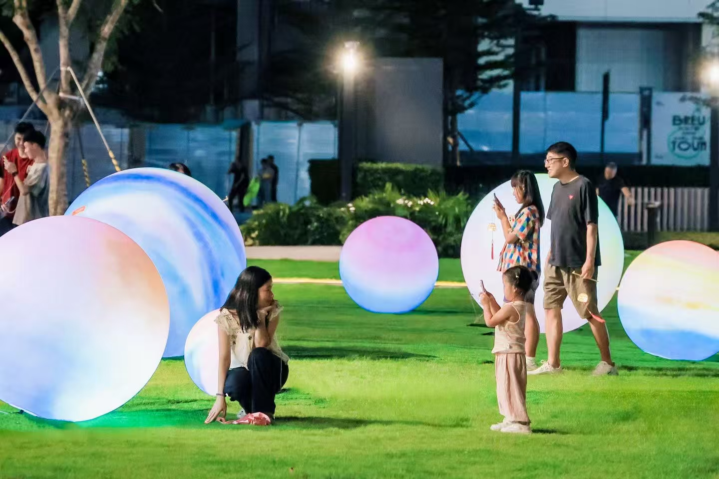 10月6日晚的庆典广场成为活动高潮。“月光音浪派对”开场后,市民踩在草坪上,伴随R&B旋律轻轻摇摆,或仰望人造月球,在音乐与灯光交织中释放节日的欢愉与压力。