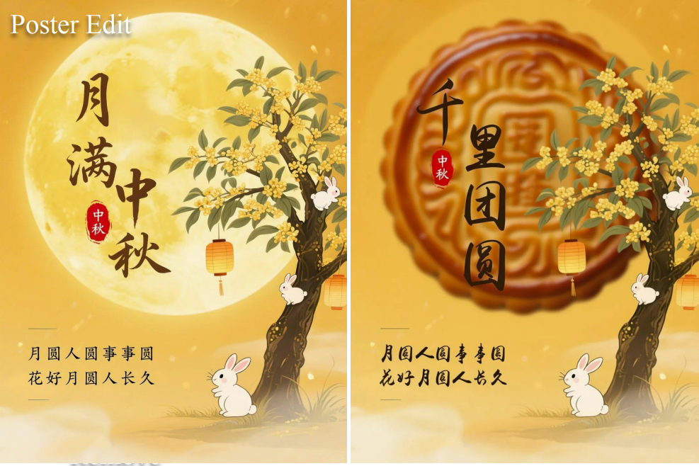 对于AI模型而言,理解中文尤其是复杂书法艺术,曾是公认的技术难题。UniWorld-V2凭借深耕中文场景的技术积累,在这一领域实现了从“能处理”到“精通”的跨越。在“海报编辑”示例中,模型能精准理解指令,并渲染出“月满中秋”和“月圆人圆事事圆”等笔画复杂的艺术中文字体,效果清晰、语义准确。