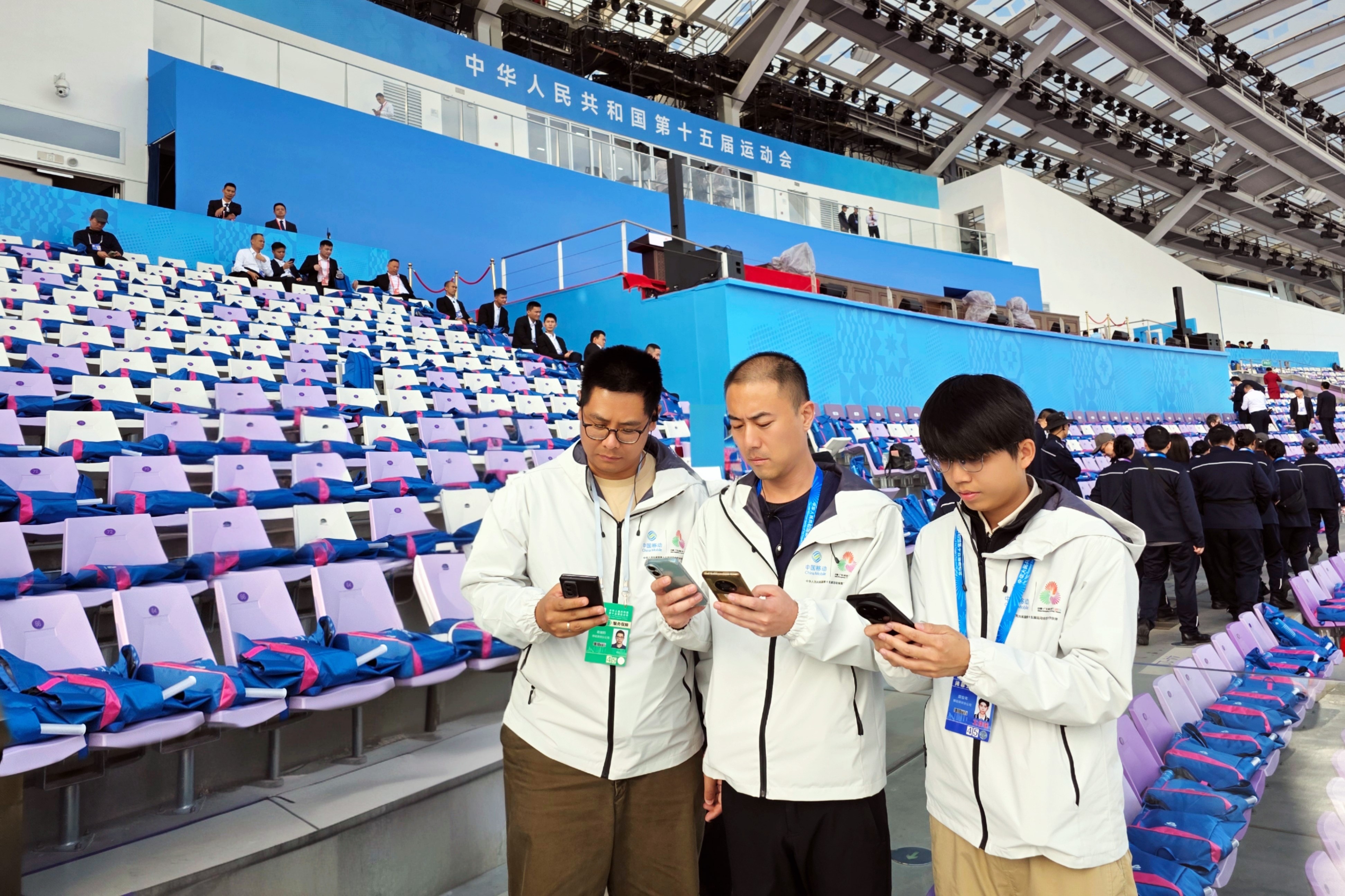 创新驱动,智赋体验。十五运会闭幕式会场人员规模庞大、场景复杂度高、通信需求瞬时集中需求大,闭幕活动对通信网络带来高要求严挑战。面对这一“大考”,深圳移动以创新技术为引擎,在欢乐剧场等场馆打造“通信高速路”:创新部署四频数字皮飞系统与赋形天线实现精准网络覆盖,并搭配异频组网技术和最先进抗干扰技术,打造4/5G高密度组网,满足剧场网络容量需求;对场馆进行5G-A升级,规模部署3CC技术,同时采用无线AI+核心网智能网元的技术融合方案,保障各类关键业务在高密度场景下保持顺畅,扫码响应及时、消息收发稳定、现场上传体验流畅。当移动用户进入欢乐剧场,手机会自动切换“中国移动 激情全运”专属LOGO,观众可即时在线分享闭幕式视频、图片,畅享5G-A网络带来的沉浸式体验。