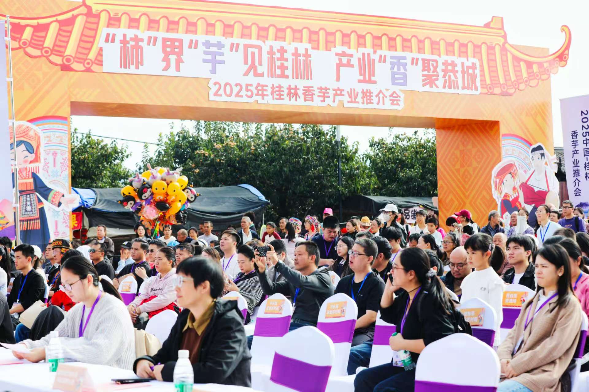 值得关注的是,活动季期间还同步举办2025年桂林香芋产业推介活动与“芋”见好“柿”农产品展销会。展销会上,恭城本地的香芋种植大户、月柿加工企业展示了各类特色产品——鲜芋、芋泥、芋头粉、芋头糕、香芋冰淇淋等香芋制品,以及脆柿、柿饼、柿子片、柿子糖等月柿深加工产品。活动还特别邀请电商直播团队与抖音农产品推介达人现场带货,通过“线上+线下”结合的方式,拓宽农产品销售渠道,让恭城的“生态好货”走向全国,助力农民增收与产业升级。