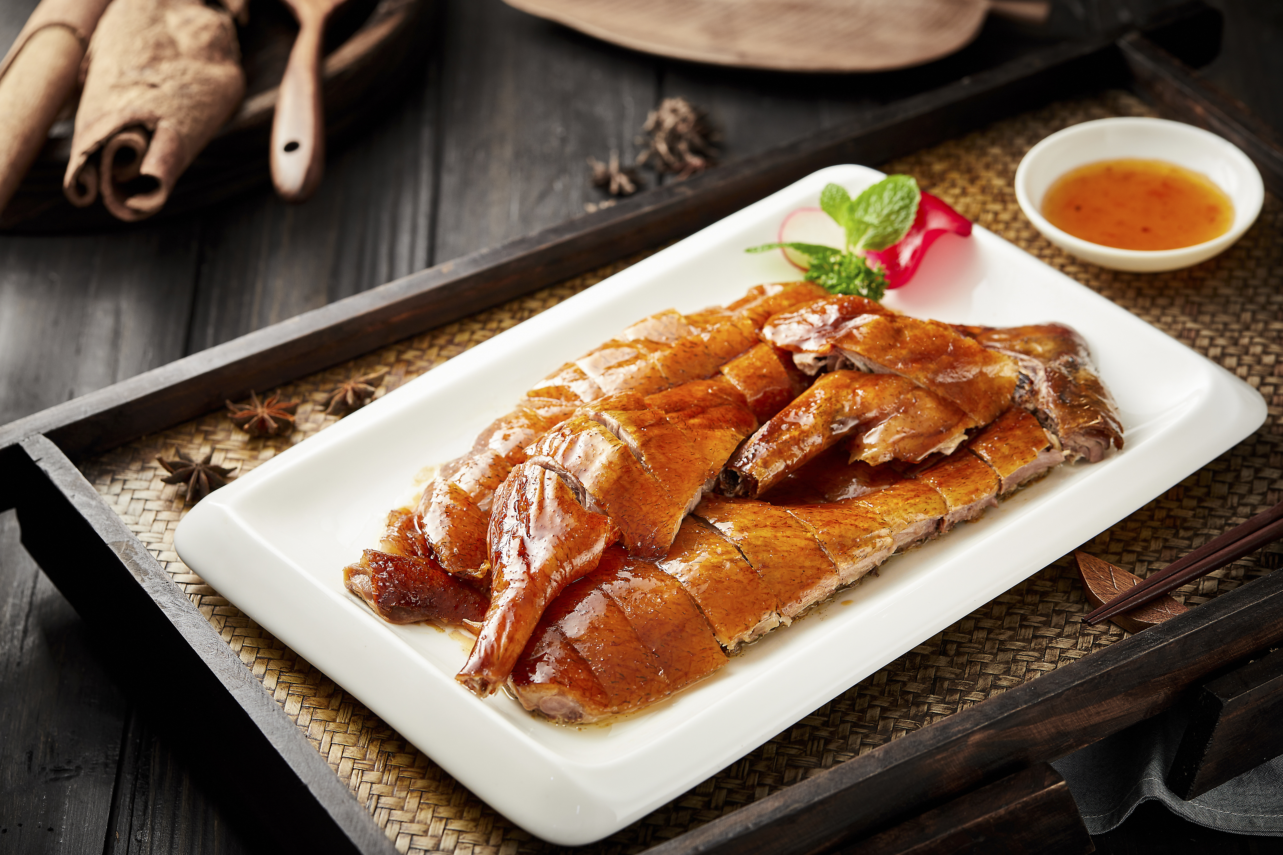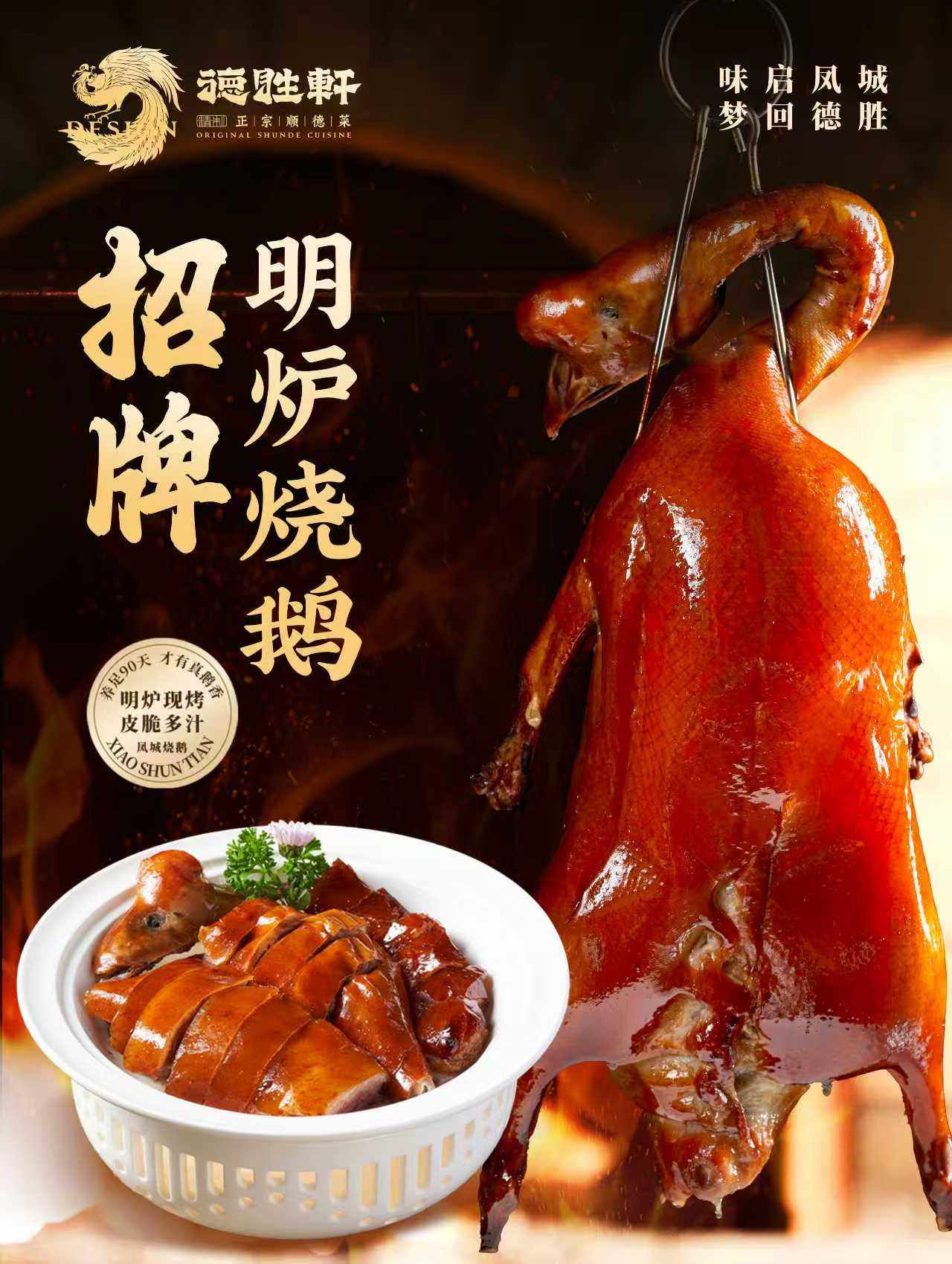 顺德招牌烧鹅,精选马冈黑棕鹅经古法工艺制作,鹅皮色泽金红,鹅肉丰腴多汁,佐以秘制酸梅酱巧妙解腻,更衬出烧鹅的丰腴本味。