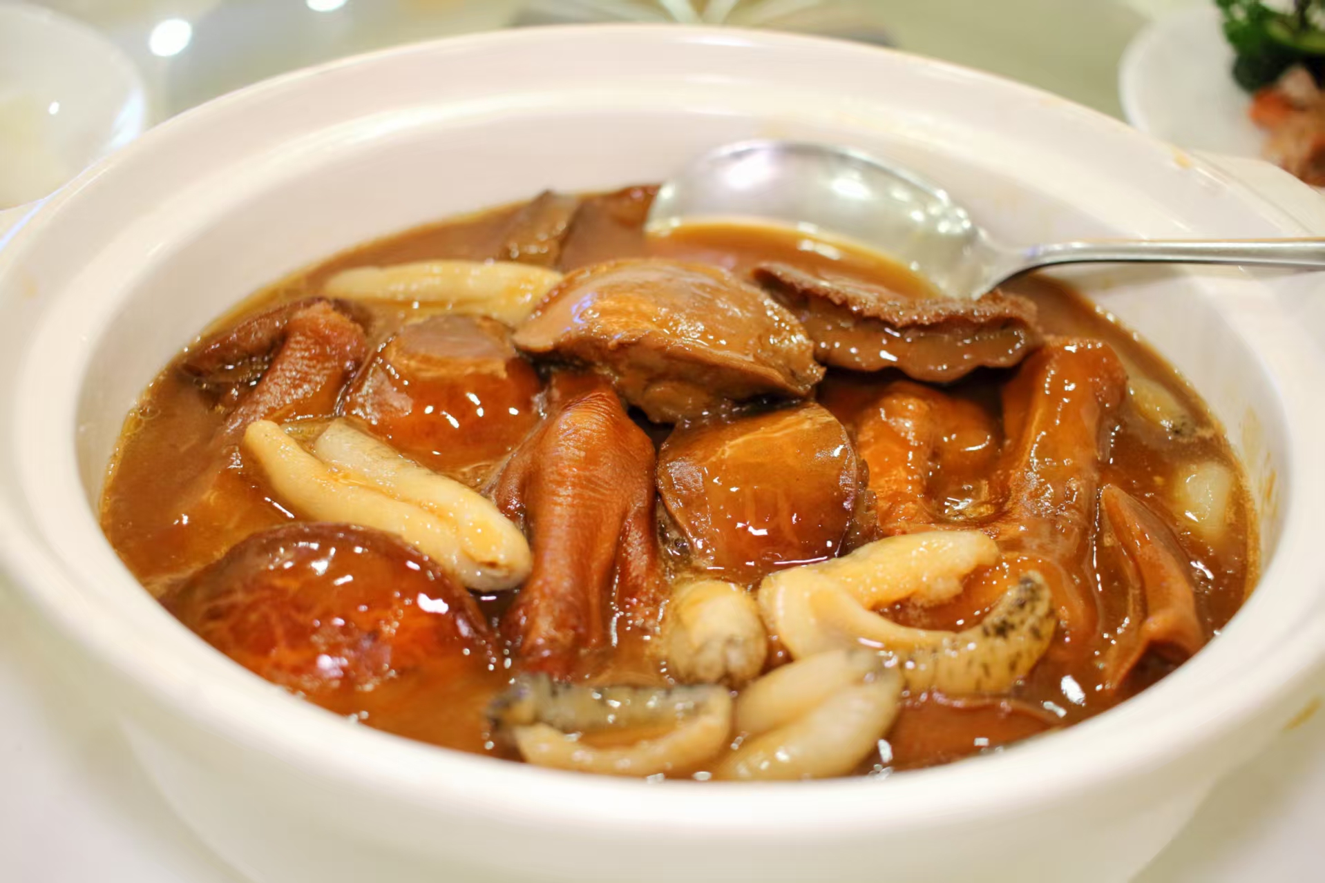 鲍汁扣三宝则是经典的粤式硬菜,鲍鱼、鹅掌与花菇在浓稠的鲍汁中慢炖入味,鲍汁的鲜美与食材的软糯完美融合,每一口都充满了胶原蛋白的醇香。