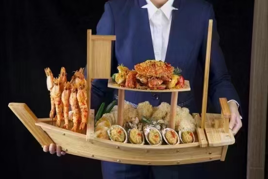 濠江盛宴是店里的排面担当,木质大船满载着炭烧大连鲍、酥炸生蚝、七味盐烤大虾等多种海鲜,上桌时仪式感拉满,寓意着“一帆风顺”。