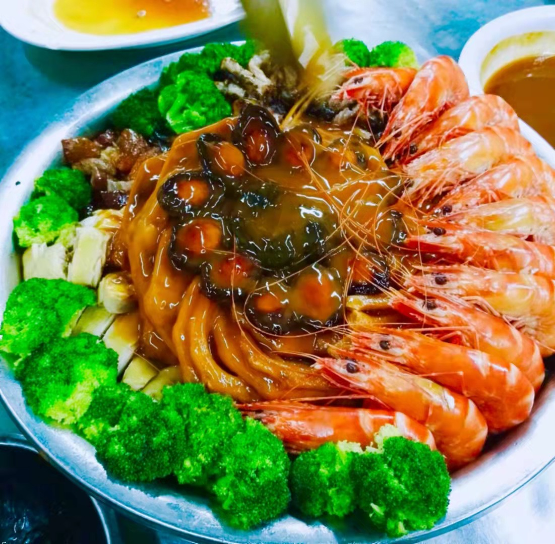 鸿运盆菜是店里的节日必备,丰富的食材层层叠叠地码放在大盆中,有鲍鱼、海参、烧鹅、白切鸡等,寓意着“盆满钵满,鸿运当头”。