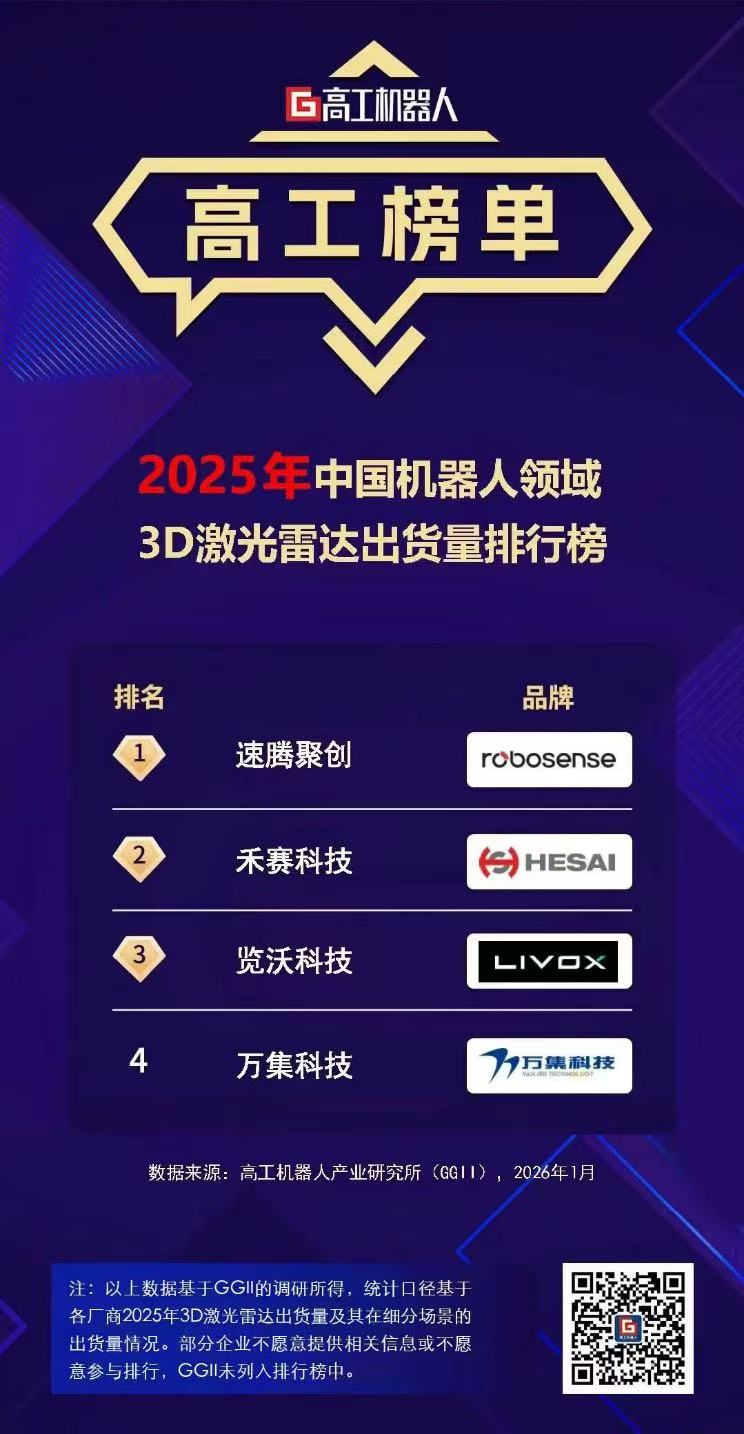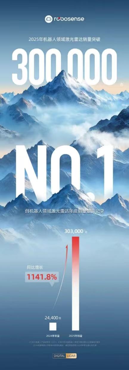 全球每三台机器人激光雷达,就有一台来自速腾聚创。1月13日,深圳AI机器人企业RoboSense速腾聚创宣布,2025年在机器人领域激光雷达产品销量达303,000台,实现同比1141.8%的强劲增长,问鼎全球行业第一。速腾聚创以全栈自研芯片构筑起高性能数字化产品实力,在智能割草机器人、无人配送、人形机器人等多个应用领域“多点开花”,推动更多细分领域的机器人技术从“概念验证”迈入“规模落地”阶段。