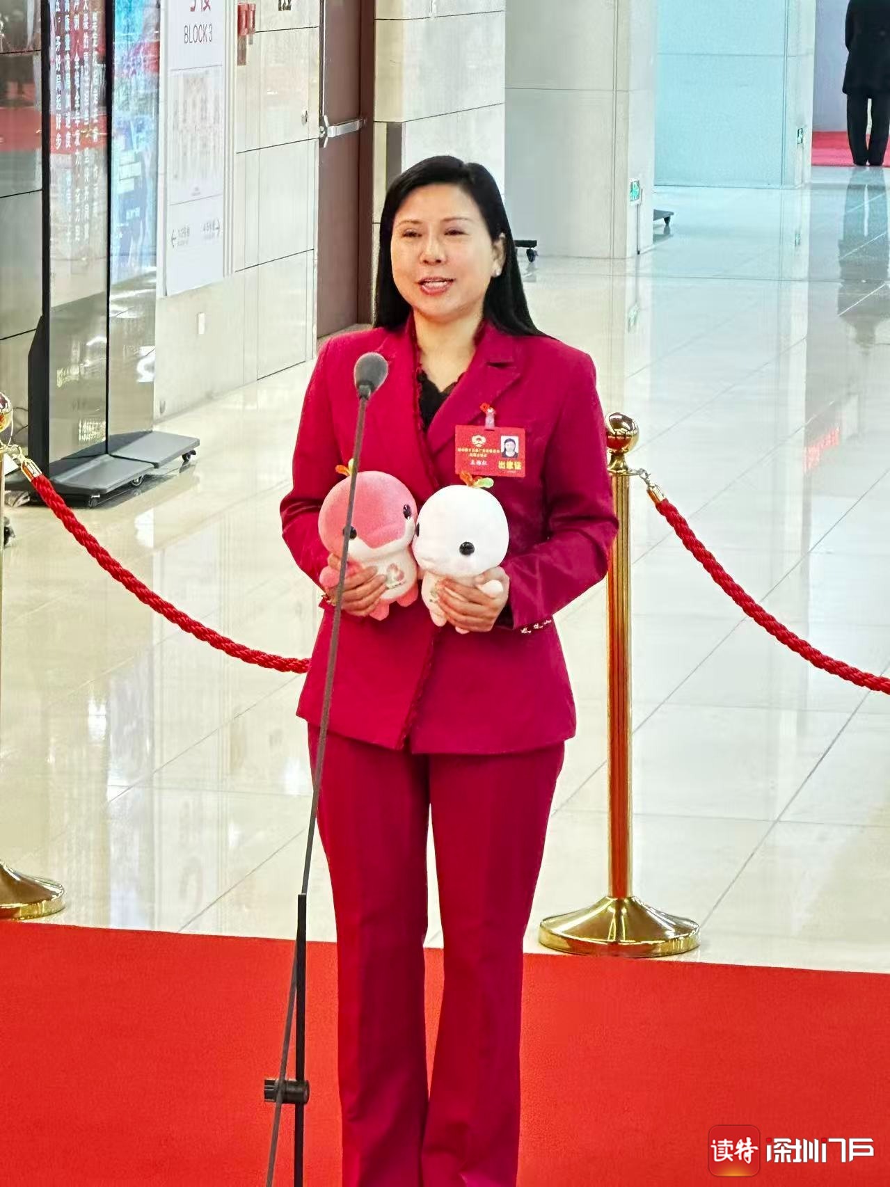 手捧白色和粉色“大湾鸡”,广东省政协委员、省出版印刷物资有限公司总经理王维红建议,持续创造“大湾鸡”IP内容,让“可爱动能”转化为“发展势能”,连接更广阔的世界,推动顶流赛事IP成为文化出海新引擎。