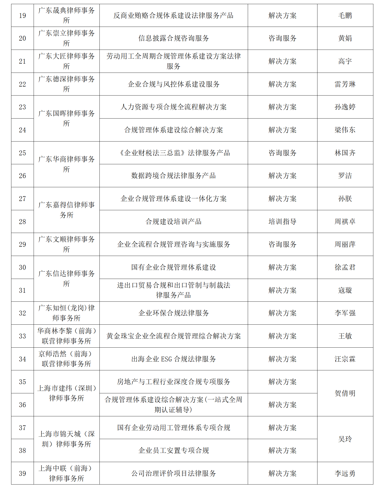 此前,深圳市司法局联合深圳市企业合规协会、深圳市律师协会面向社会公开征集企业合规专业机构及服务产品。经自愿申报、资格审核、专家评审及社会公示等流程,形成了首批入库名单。其中,服务机构包括律师事务所、会计师事务所、科技企业及研究机构等多元服务主体,所提供的服务产品涉及合规管理体系建设综合解决方案、认证与有效性评价、培训指导、专项咨询及信息化工具软件等多种类型合规管理专业服务。