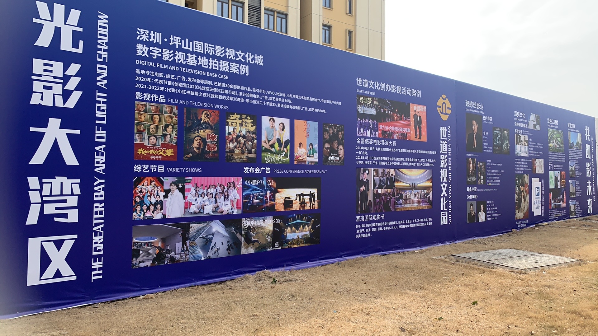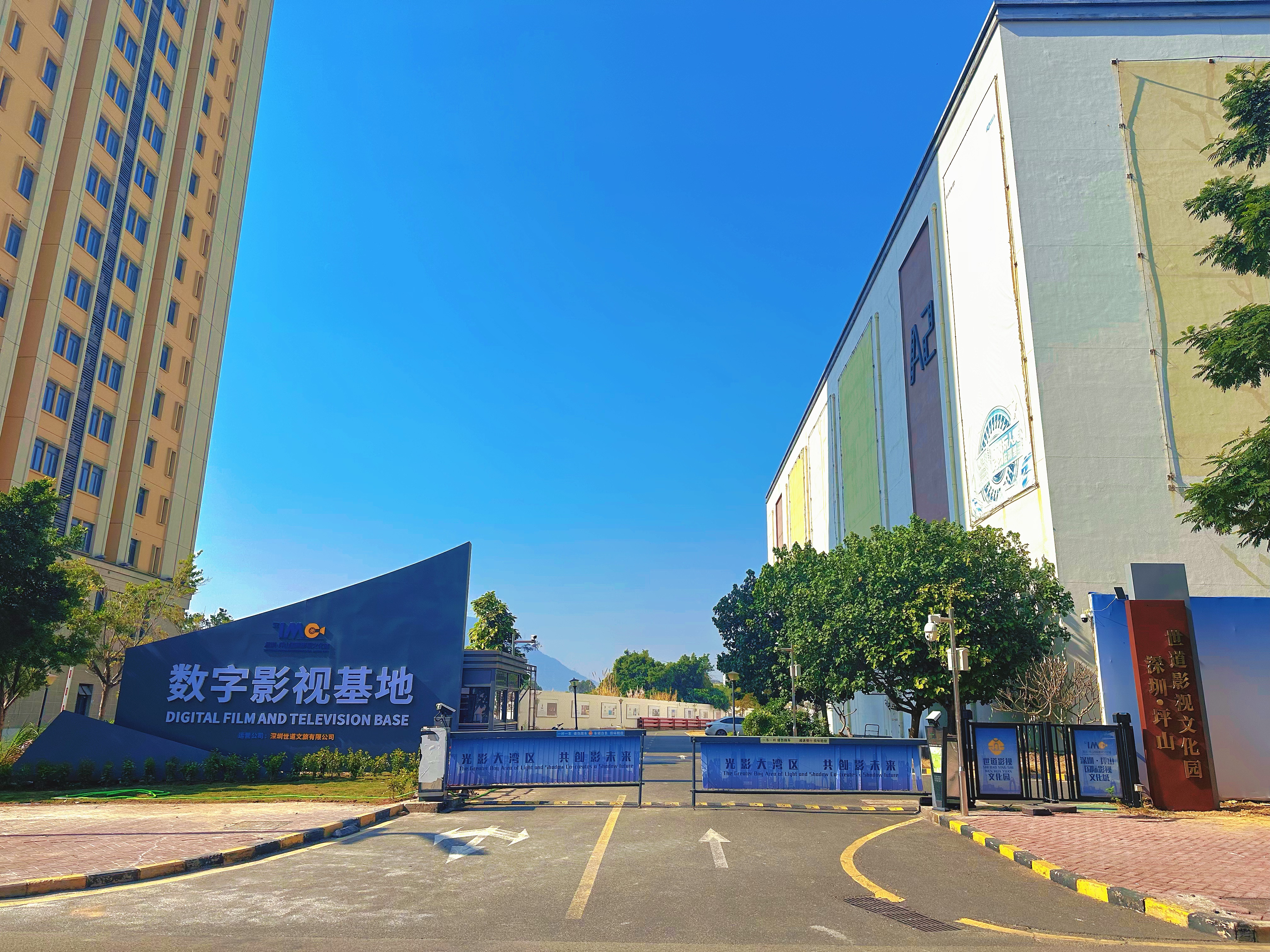 当车驶入深圳市坪山区碧玲街道深圳国际影视文化城,天空是一种崭新的蓝。眼前的坪山影视基地,风格是割裂又统一的,它由几个清晰的部分拼合而成:核心是四栋(A1至A4)功能明确的建筑,像冷静的工业盒子,这里涵盖拍摄、化妆、休息等全套配套,而周边其他写字楼、公寓、酒店及部分餐厅属外部配套。