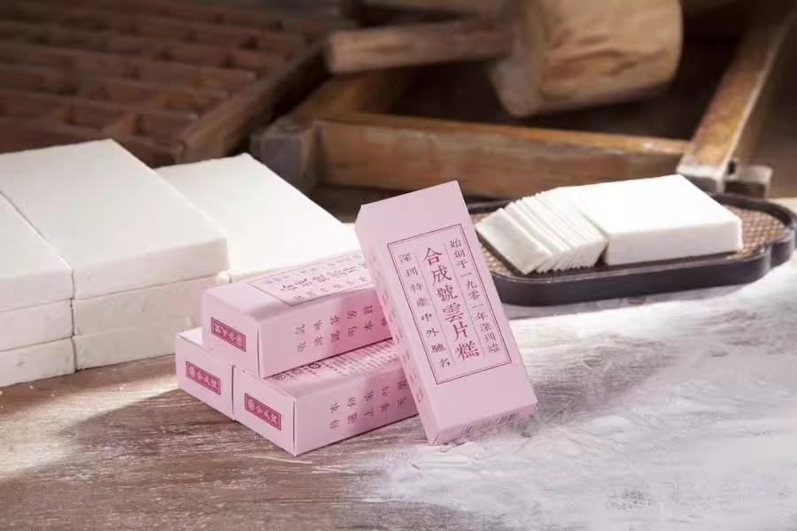 省级非遗深圳云片糕是合成号的灵魂单品。传承自1901年的制作技艺,严格遵循25道古法工序:从精选深圳咸淡水交界处特产的纯白大糯米,以本地细沙翻炒膨化,到糕粉历经半年陈化,再加入进口奶油与白砂糖等六种辅料调合,最终手工切出薄如纸、白如雪、柔如云的糕片。入口细糯绵滑,甜而不腻,米香与榄仁、桂花等香气交融,不仅是舌尖的享受,更是承载几代深圳人记忆的乡愁之味。