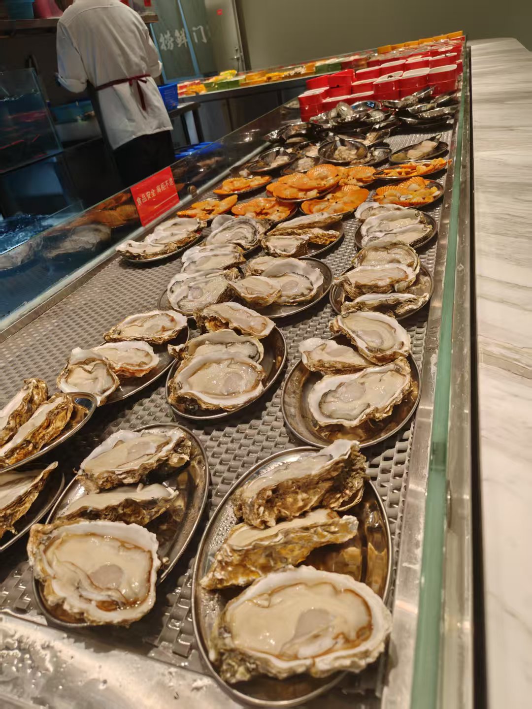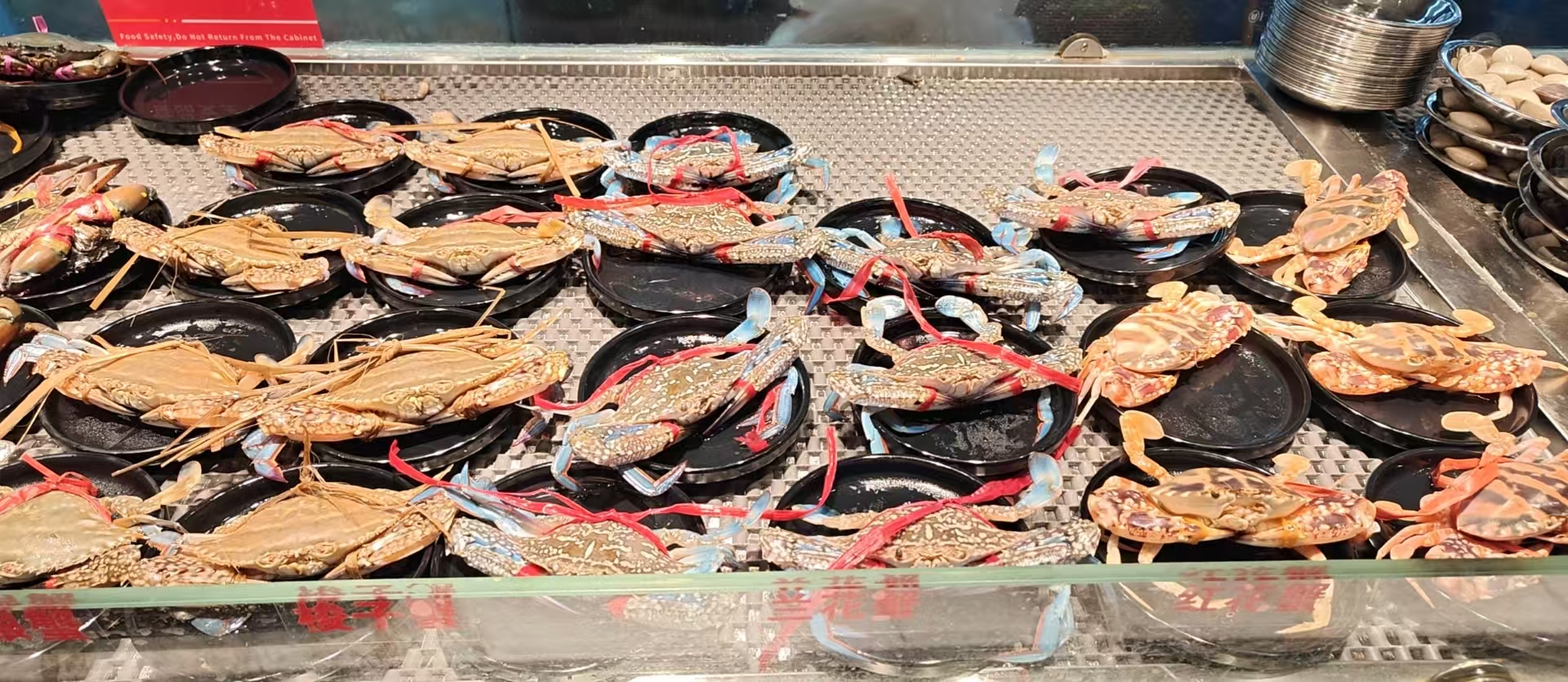 食材诚意拉满,现切吊龙肥瘦相间、纹理清晰,入锅涮几秒即熟,入口鲜嫩多汁。手打虾滑Q弹紧实。鲜活罗氏虾、鲍鱼、生蚝等现捞现处理,保留极致鲜甜。店内采用按盘色计价的方式,食材明码标价,丰俭由人,让顾客轻松实现海鲜自由。