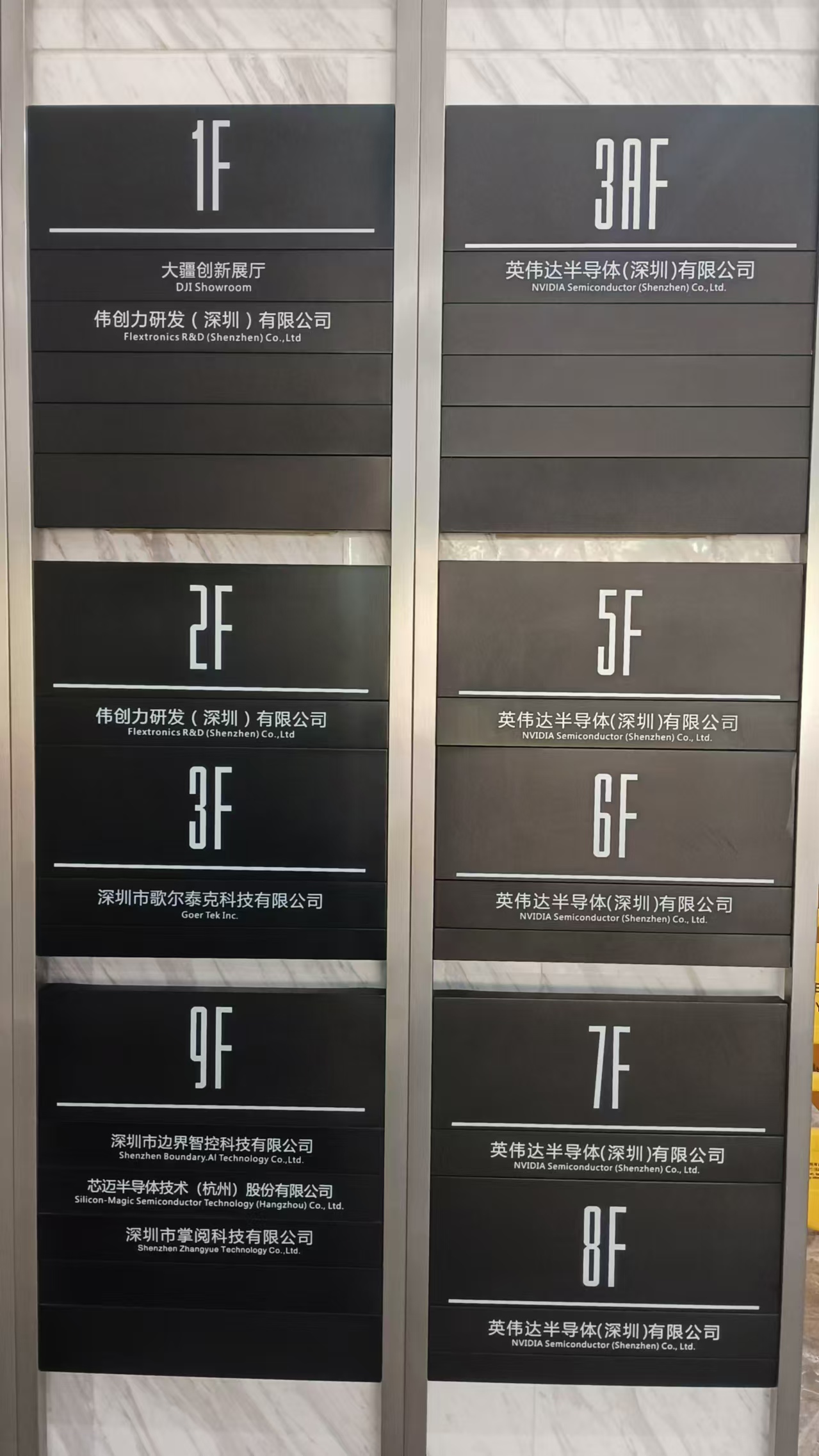 英伟达半导体(深圳)有限公司位于深圳市南山区粤海街道高新区社区高新南九道009号的金地威新软件科技园8号楼。从一楼大堂的指示牌可以发现,英伟达半导体(深圳)有限公司所在的8号楼共有9层,集中了多家科技公司,包括伟创力研发(深圳)有限公司、深圳市歌尔泰克科技有限公司、深圳市边界智控科技有限公司等。英伟达占据4至8层。