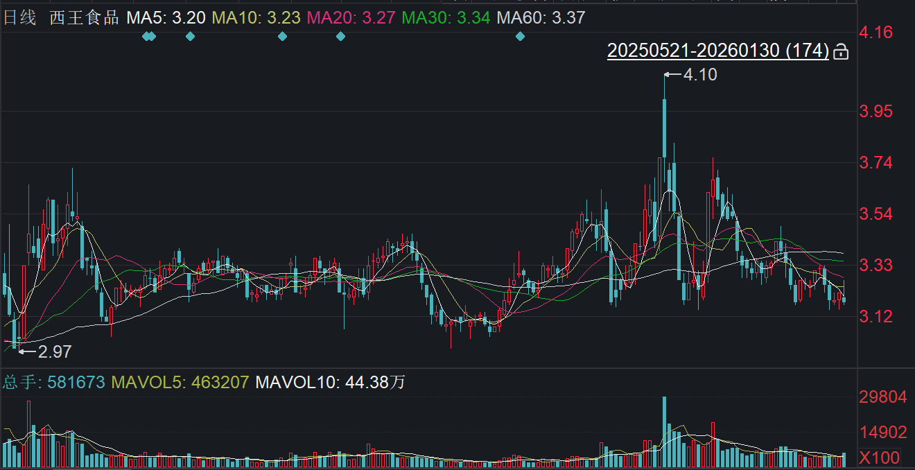 二级市场上,截至1月30日收盘,西王食品下跌1.25%报3.17元/股,总市值约34.22亿元,近一年来公司股价近乎“原地踏步”。