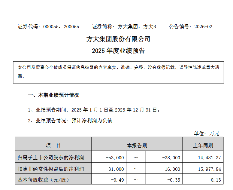 1月31日, 方大集团发布2025年度业绩预告,预计全年归属于上市公司股东的净利润亏损3.8亿元至5.3亿元,同比由盈转亏(2024年同期盈利1.45亿元)。扣除非经常性损益后的净利润亏损1.6亿元至3.1亿元。