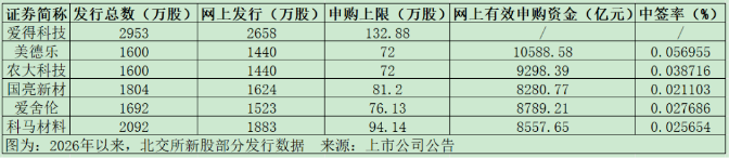 2026年以来,北交所已发行上市新股的网上有效申购资金,均迈过8000亿元的门槛,其中美德乐的网上有效申购资金约为1.06万亿元。一名投资者评论:“说明市场还是不差钱啊!”