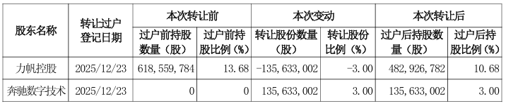 2025年12月24日,公司收到股东力帆控股的通知,本次协议转让交易已取得上海证券交易所的合规性确认,并于2025年12月24日取得中国证券登 记结算有限责任公司出具的《证券过户登记确认书》,过户日期为2025年12月23 日,过户数量为135,633,002股(占公司股份总数的3.00%),股份性质为无限售流通股。