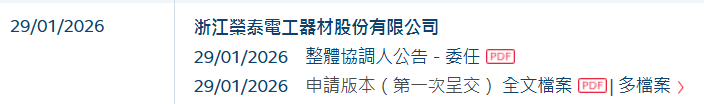 港交所网站显示,近日,浙江荣泰电工器材股份有限公司(以下简称“浙江荣泰”)向港交所递交了上市申请,计划发行H股并在主板挂牌上市,中信证券担任其独家保荐人。
