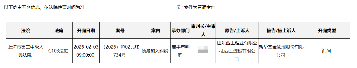 根据上海市高级人民法院官网披露的信息,2月3日9时,上海市第二中级人民法院将正式开庭询问山东西王糖业有限公司、山东西王淀粉有限公司起诉新华基金的“债务加入纠纷”案。
