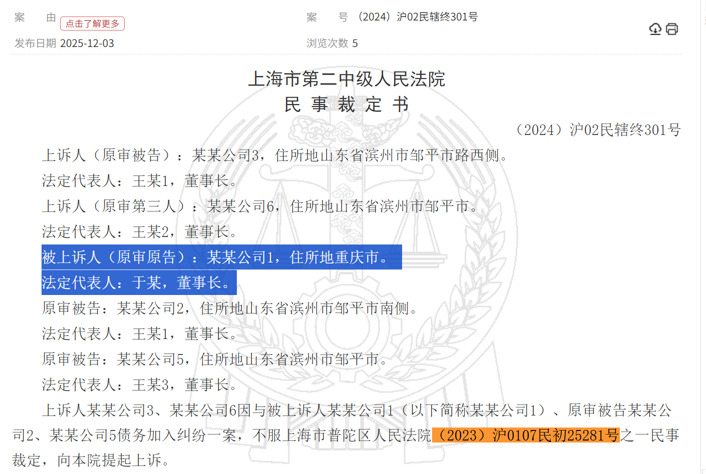 记者查询裁判文书网发现,上海市第二中级人民法院曾在2024年5月17日作出了民事裁定书,核心争议点在于上海市普陀区人民法院是否对此拥有管辖权。其中提到,“某某公司6管理人于2023年5月25日再次发布债权人会议公告,并于2023年6月9日召开的债权人会议上就西王集团和解协议变更方案(草案)表决通过”“某某公司1已经向某某公司6管理人申报债权,和解协议变更方案对该债权的清偿有特别约定”。裁定书中提到的“某某公司6,住所地山东省滨州市邹平市”“法定代表人:王某2,董事长”,符合西王集团相关信息;“某某公司1,住所地重庆市”“法定代表人:于某,董事长”符合新华基金相关信息(2023年4月~2024年12月,公司法定代表人为于春玲)。