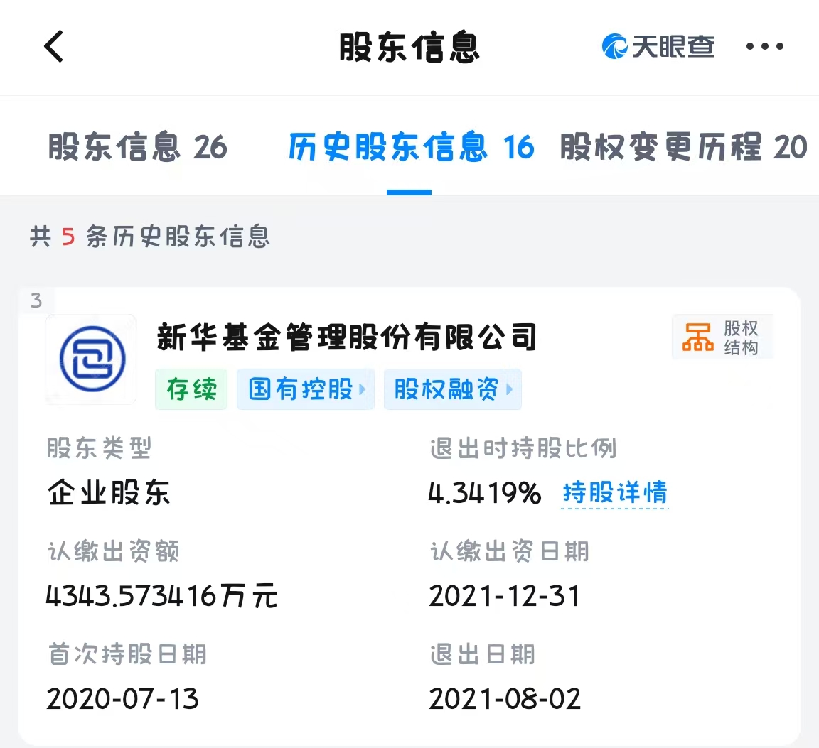 天眼查关系图谱还显示,新华基金大股东为金融街证券股份有限公司,而其与国民信托有限公司均持有东营融创控股有限公司股权;国民信托有限公司持有西王集团近14%的股份。近年来,以上三家企业的大股东西王集团债务压力不小,曾在2019年曝出债券违约;2020年7月,新华基金首次持有西王集团股权,并在次年8月退出,彼时的持股比例为4.34%。