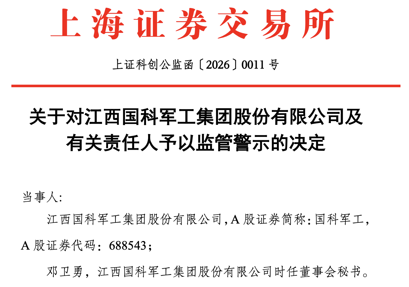 对此,上交所决定,对国科军工及时任董事会秘书邓卫勇予以监管警示。