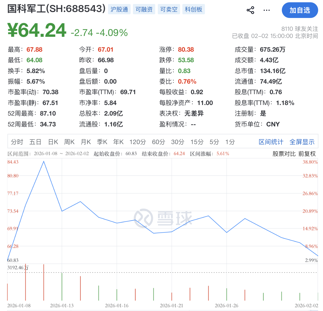 截至2月2日收盘,国科军工报64.24元/股,总市值134.16亿元。1月8日~1月12日,该股股价整体涨超37%,1月13日起震荡回落,至今已回落超23%。