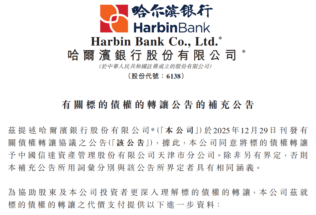 近日,哈尔滨银行(06138.HK)发布补充公告,进一步披露了其与中国信达资产管理股份有限公司天津市分公司不良债权转让的价款支付安排及清收收益分成细则。