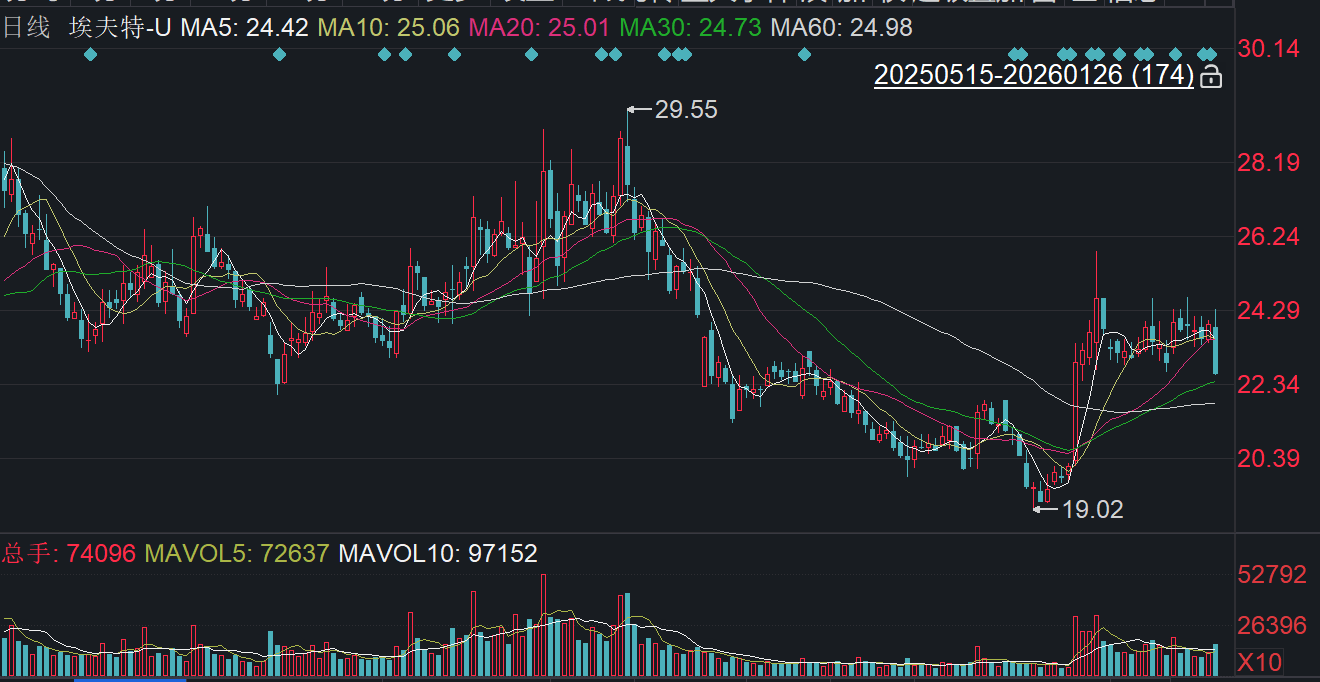 二级市场上,截至停牌前一个交易日1月26日收盘,埃夫特股价报22.57元/股,总市值约117.77亿元,近一年来累计下跌约33%。