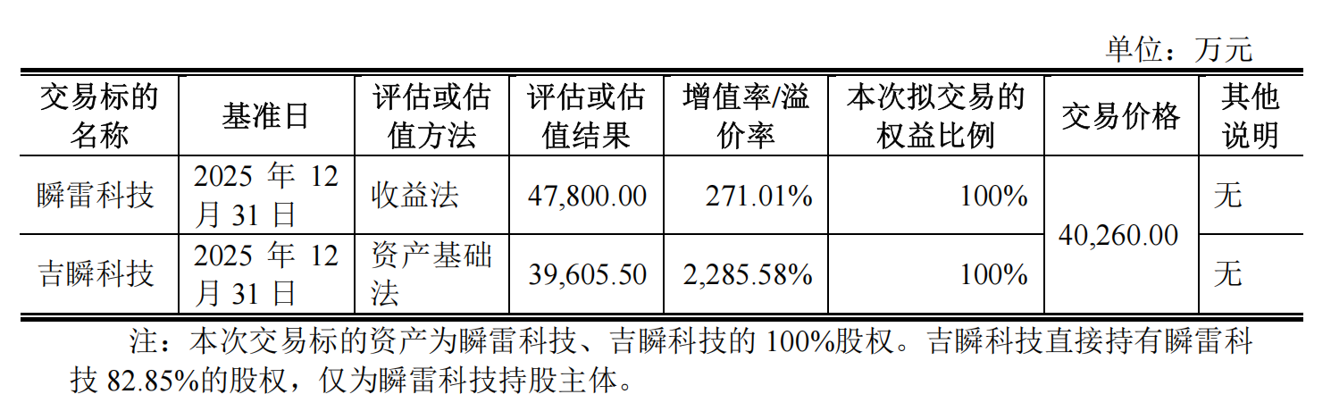 公告显示,标的公司评估增值较高。根据收益法评估结果,截至评估基准日,瞬雷科技100%股权评估值为4.78亿元,评估增值率为271.01%。