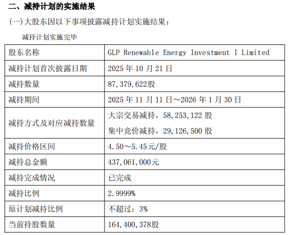 公告显示,该减持计划始于2025年10月21日,原定减持期间为2025年11月11日至2026年2月11日。实施期间,GLP通过集中竞价减持2912.65万股,大宗交易减持5825.31万股,减持价格区间为4.50元/股至5.45元/股,累计套现约4.37亿元。