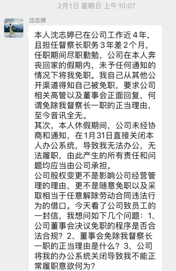 淳厚基金官网于1月31日发布的最新一则高管任免公告显示,刘玉生任公司首席信息官(副总经理),总经理左季庆代任督察长;而原督察长沈志婷因工作安排离任。网传群聊截图显示,沈志婷曾表示自己是在奔丧回家的假期内,从其他公开渠道得知自己被免职,而并未获得公司任何通知,其办公系统也被直接关闭。