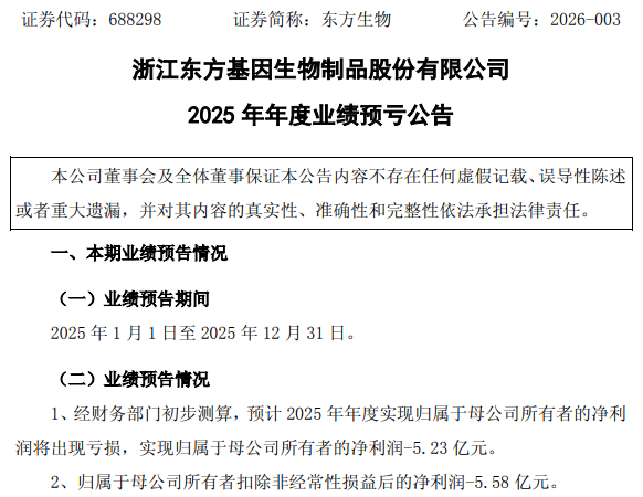 1月30日,东方生物(688298)发布2025年年度业绩预亏公告。公司2025年年度归属于母公司所有者的净利润预计亏损5.23亿元;归属于母公司所有者扣除非经常性损益后的净利润预计亏损5.58亿元。