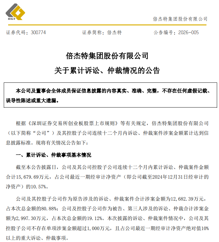 2月3日盘后,倍杰特(300774)发布公告,截至本公告披露日,公司及其公司控股子公司连续十二个月内累计诉讼、仲裁案件金额合计15,679.69万元,占公司最近一期经审计净资产(即公司截至2024年12月31日经审计的净资产)的10.57%。