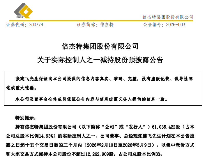 二级市场上,倍杰特2月3日收盘报23.12元/股,涨1.81%,公司最新总市值94.51亿元。以此收盘价计算,张建飞拟最高减持的这12,262,909股的目前市值为2.835亿元。