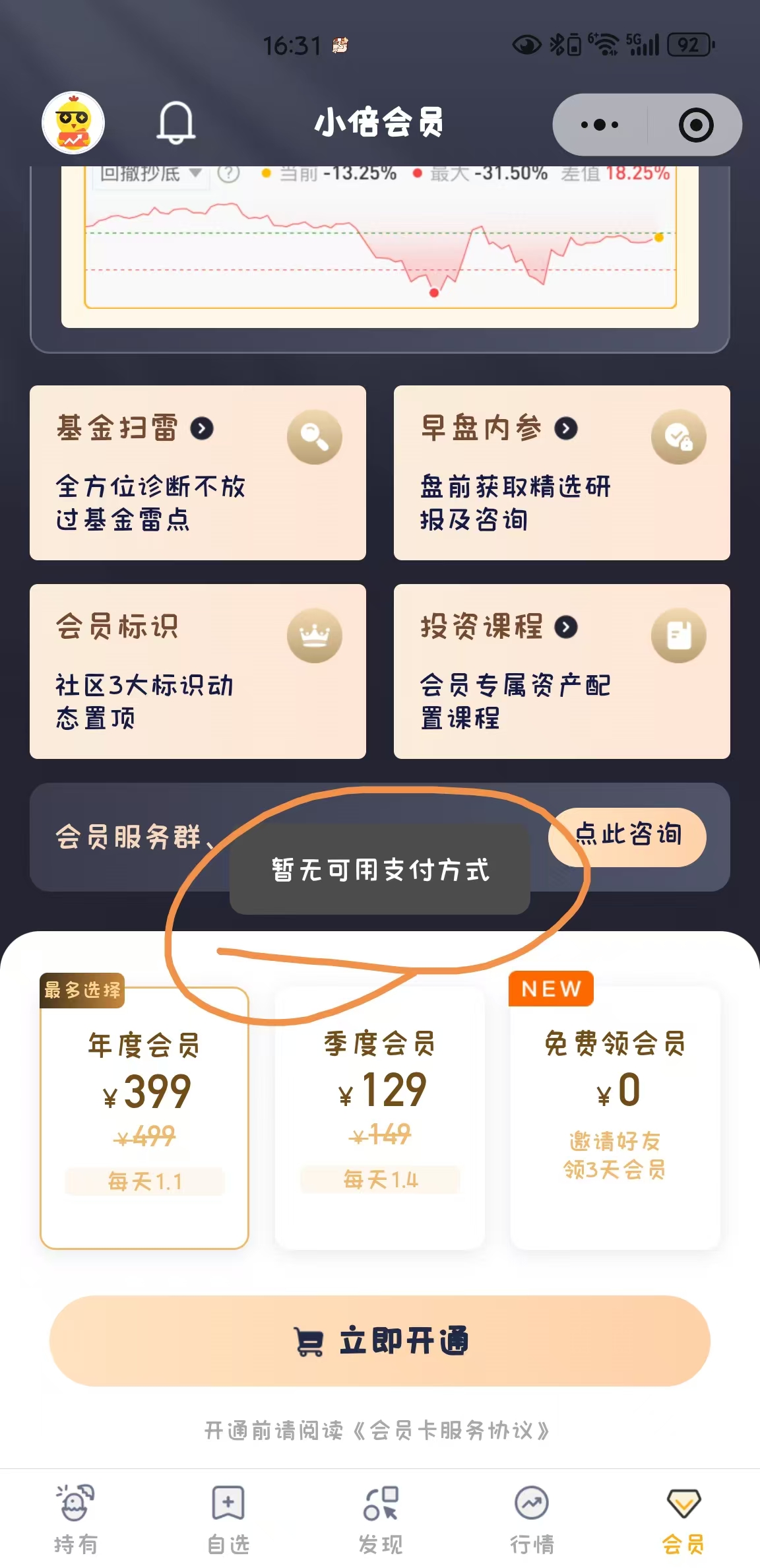 本次监管部门进一步加大整治力度,多个理财平台跟进。至记者发稿时为止,蚂蚁基金、京东金融、腾讯理财通、天天基金、同花顺等第三方代销机构下架了实盘榜单、板块涨跌幅等相关的功能与服务。小倍养基、养基宝等小程序宣布下架基金估值模拟计算,博主汇总,或是基金加仓榜、减仓榜等功能。记者注意到,以上两个小程序的会员功能也被暂停:在进行开通会员操作时,前者显示“暂无可用支付方式”,后者显示“当前服务异常或非法操作,请稍后再试”。