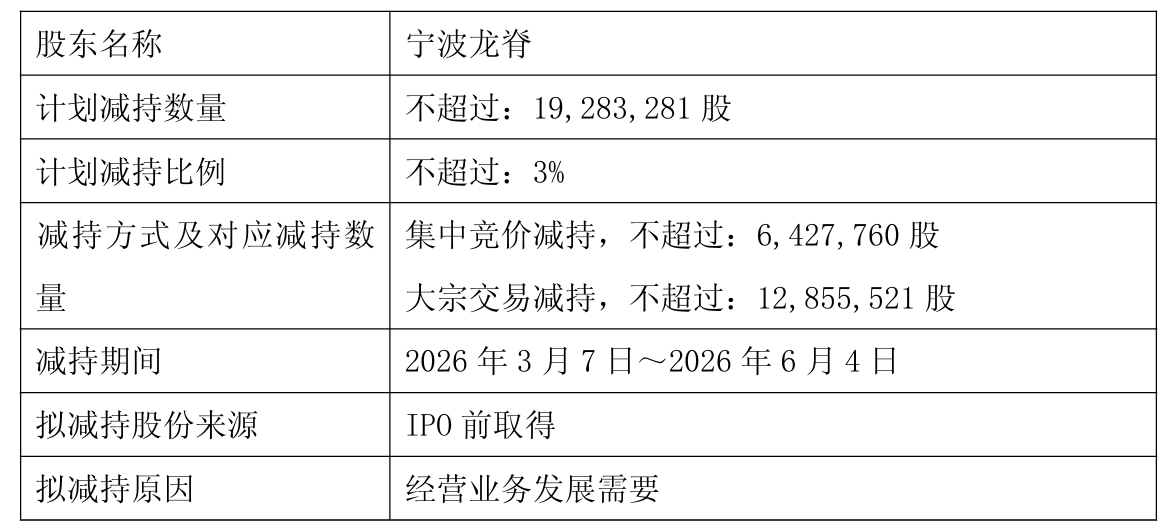截至公告日,宁波龙嵴持有公司无限售条件流通股8438.94万股,占公司总股本的13.13%,为公司第二大股东;上述股东本次拟减持的股份均来源于公司首次公开发行股份前取得。
