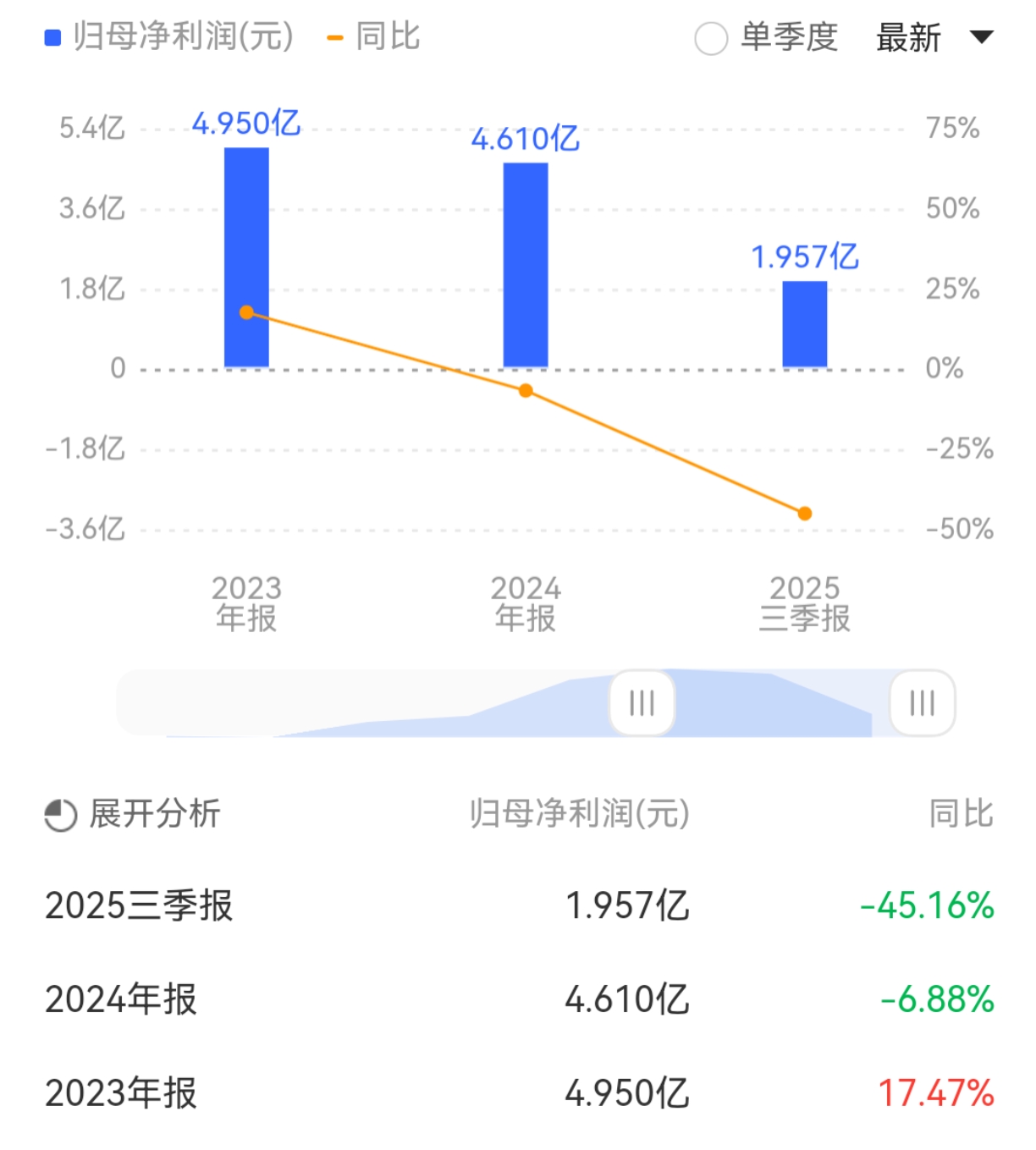 上市次年,江盐集团营收净利便双双下滑,去年前三季度下滑幅度扩大。2025年前三季度公司实现营业收入16.92亿元,同比下降15.73%;归母净利润1.96亿元,同比下降45.16%。