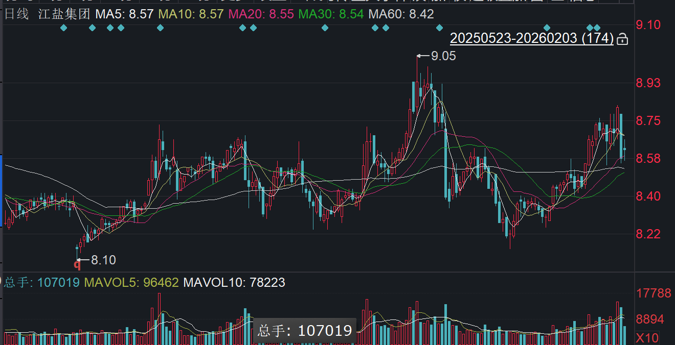 二级市场上,截至2月3日收盘,江盐集团上涨0.47%报8.61元/股,总市值约55.34亿元,近一年来公司股价近乎“原地踏步”。