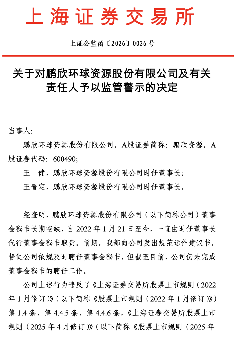 根据上交所在2026年2月3日发布的公告,鹏欣资源(600490)及其时任董事长王健和王晋定收到了监管警示。