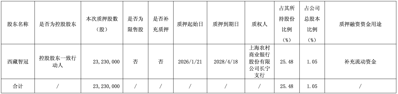 西藏智冠于2026年1月21日将其持有的公司无限售流通股23,230,000股质押给上海农村商业银行股份有限公司长宁支行,并在中国证券登记结算有限公司上海分公司完成相关质押登记。质押融资资金用途为补充流动资金。