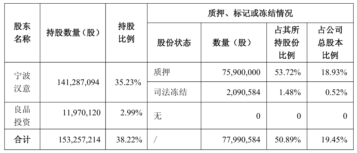 截至公告日,控股股东宁波汉意累计质押7590万股,占其所持股份比例为53.72%,占公司总股本比例为18.93%;累计209.06万股被司法冻结,占其所持股份比例为1.48%,占公司总股本比例为0.52%