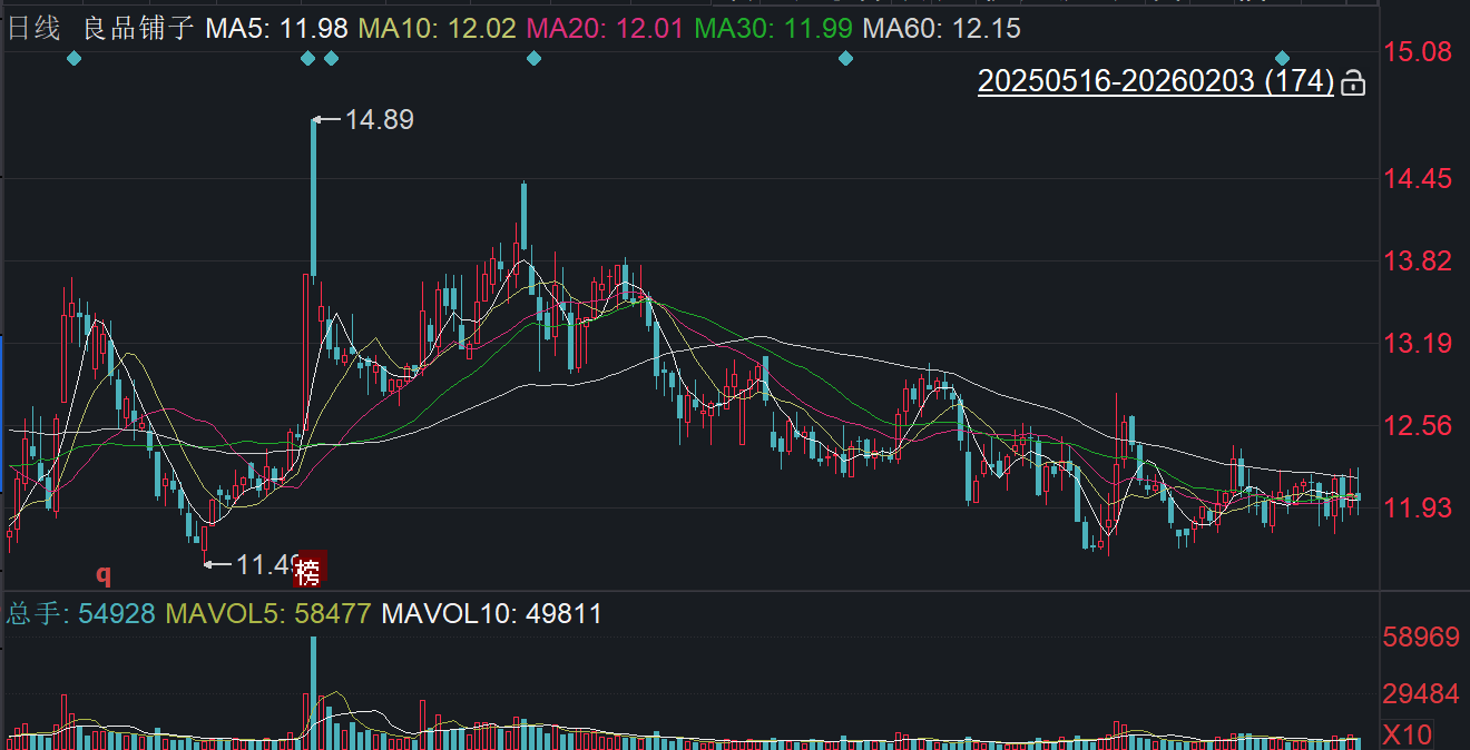二级市场上,截至2月3日收盘,良品铺子下跌0.50%报11.97元/股,总市值约48亿元,近一年来公司股价累计下跌近两成。