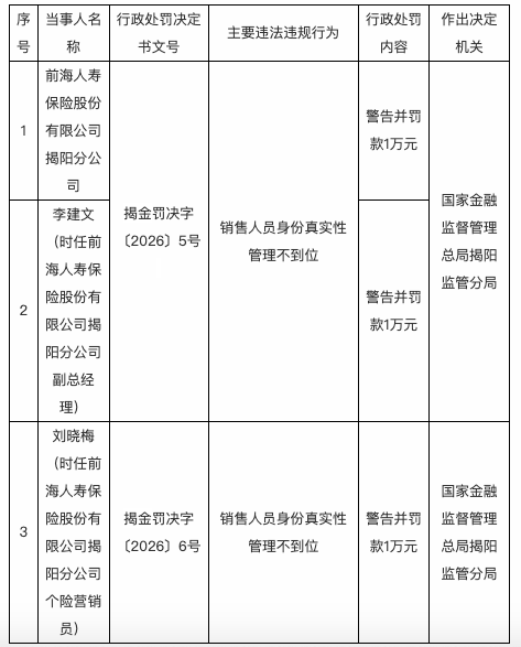 针对上述违法违规行为,国家金融监督管理总局揭阳监管分局对其警告并罚款1万元;对时任前海人寿保险股份有限公司揭阳分公司副总经理李建文警告并罚款1万元;对时任前海人寿保险股份有限公司揭阳分公司个险营销员刘晓梅警告并罚款1万元。