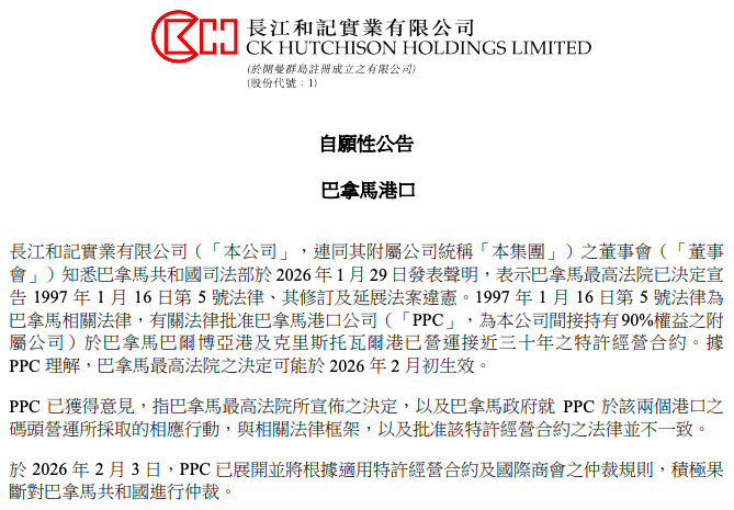 据公告,1997年1月16日第5号法律为巴拿马相关法律,有关法律批准巴拿马港口公司(PPC,为长和间接持有90%权益之附属公司)于巴拿马巴尔博亚港及克里斯托瓦尔港已营运接近三十年之特许经营合约。据PPC理解,巴拿马最高法院之决定可能于2026年2月初生效。