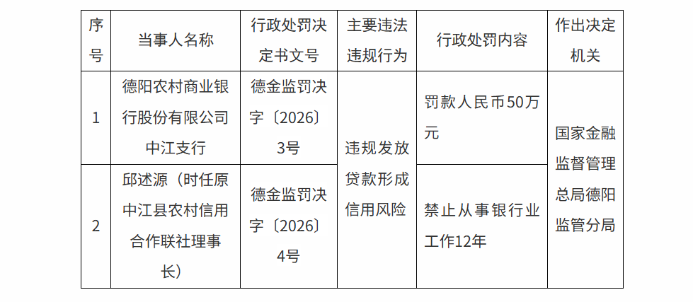 2月3日,国家金融监督管理总局四川监管局披露的行政处罚信息公开表显示,德阳农村商业银行股份有限公司(以下简称德阳农商行)两支行及相关责任人因违规发放贷款形成信用风险被罚。